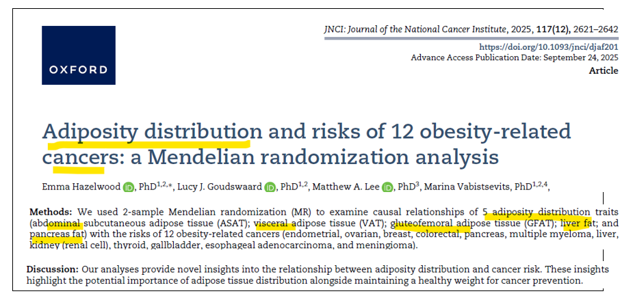 Cette étude prétend démontrer que la façon dont le surpoids (l’adiposité) se répartit dans notre organisme joue un rôle prépondérant sur le risque de certains cancers. Plus que le degré de surpoids !