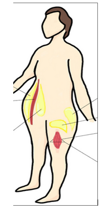 je vais (encore) simplifier ces deux formes de surpoids (et de distribution de l’adiposité) avec le graphique ci-dessous : à droite, la forme glutéofémorale (qui concerne les fesses et les cuisses ; certains disent forme « gynoïde ») et, à gauche, la forme abdominale (qui concerne surtout le tour de taille ou forme « androïde »).